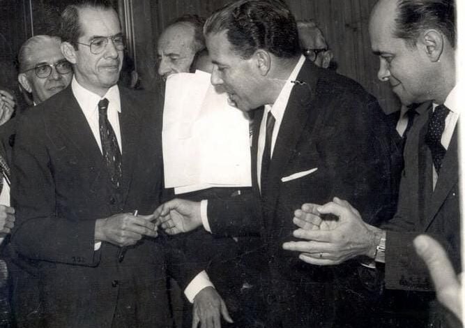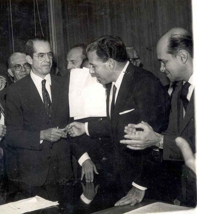Foto: José Guiomar, Jango e Tancredo Neves na assinatura da lei. (Agência de Notícias do Acre)
