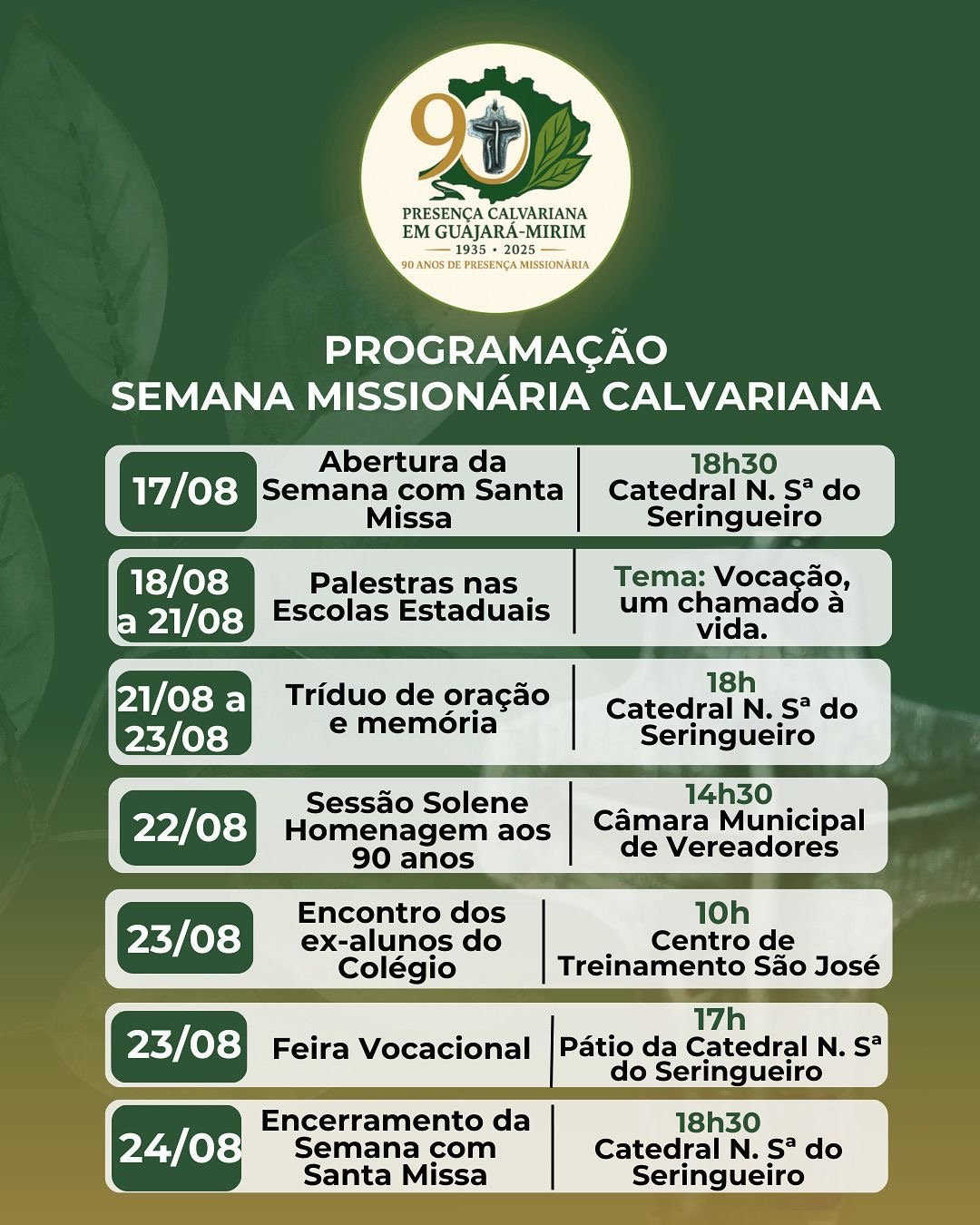 A Semana Calvariana Missionária, em comemoração aos 90 anos da presença Calvariana em Guajará-Mirim, começou no domingo, 17, e vai até o próximo dia 24, quando ocorrerá o encerramento.