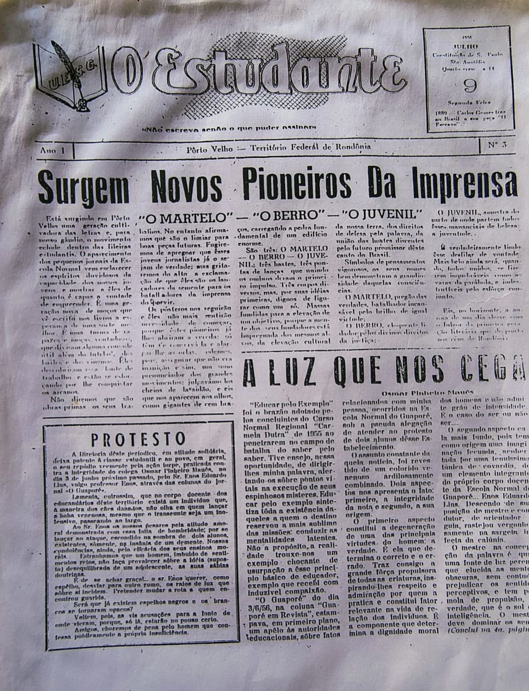 Na capa “O Estudante” protestava contra coluna assinada pelo professor Enos Eduardo Lins, no jornal “O Guaporé” acusando Enos de ter agredido o aluno Osmar Pinheiro Maués, um dos redatores do jornal.