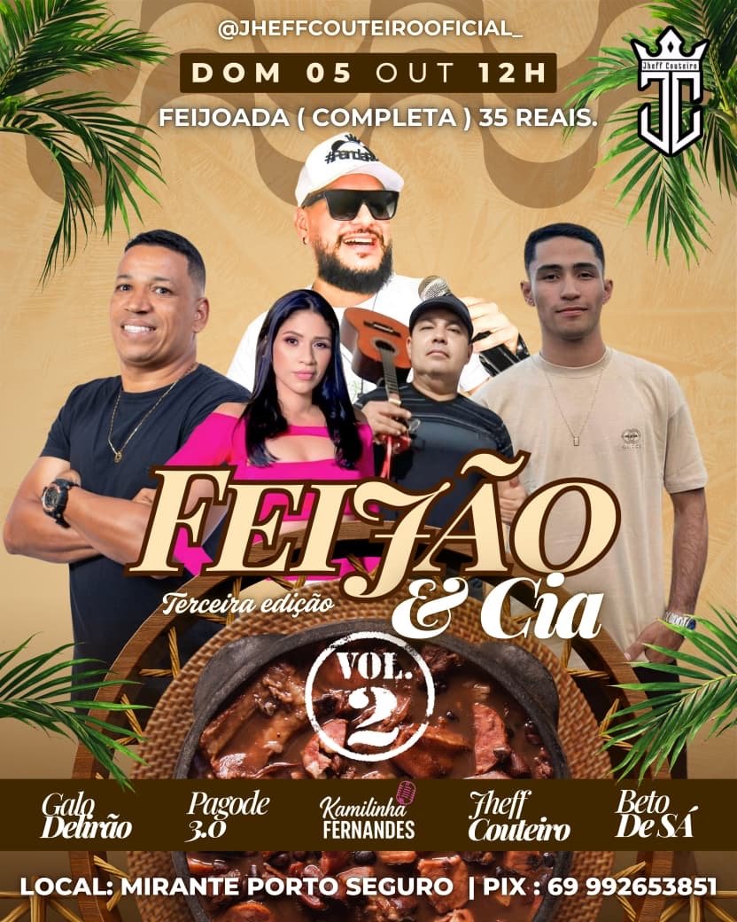 O Mirante Porto Seguro, localizado no final da Av. Campos, no Tamandaré, realiza neste domingo, 05, a Segunda Feijoada do Jhef Couteiro, com som ao vivo a partir do meio dia até as 22 horas (10 da noite).
