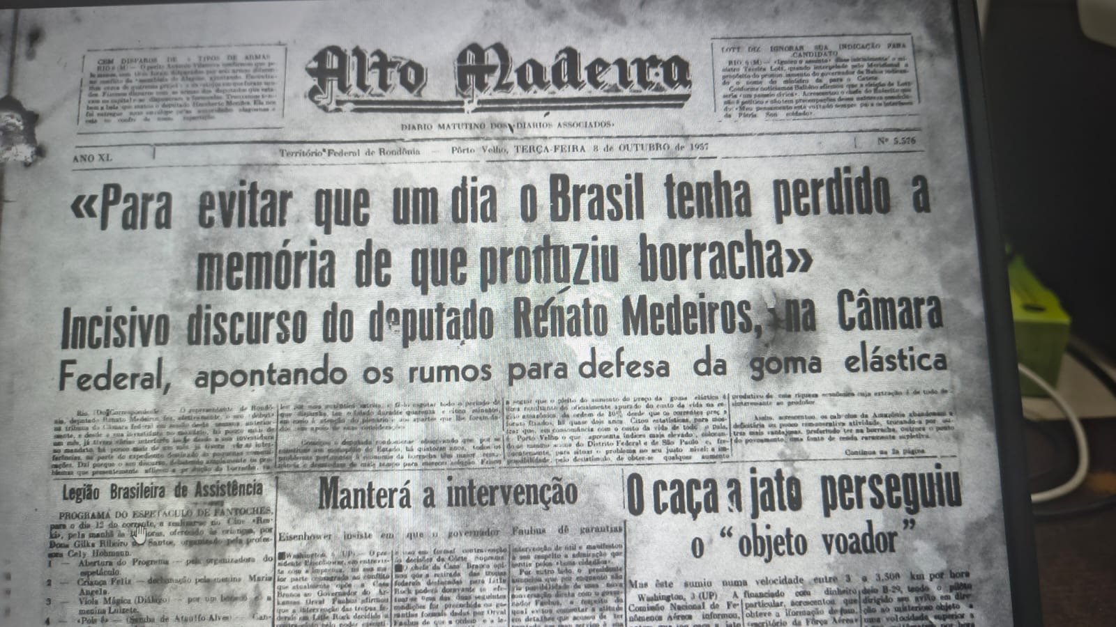1957 – Na Câmara Federal o deputado Renato Medeiros (RO) lembra a importância histórica da borracha, a sua contribuição para a economia nacional durante anos e o abandono a que o produto está relegado.