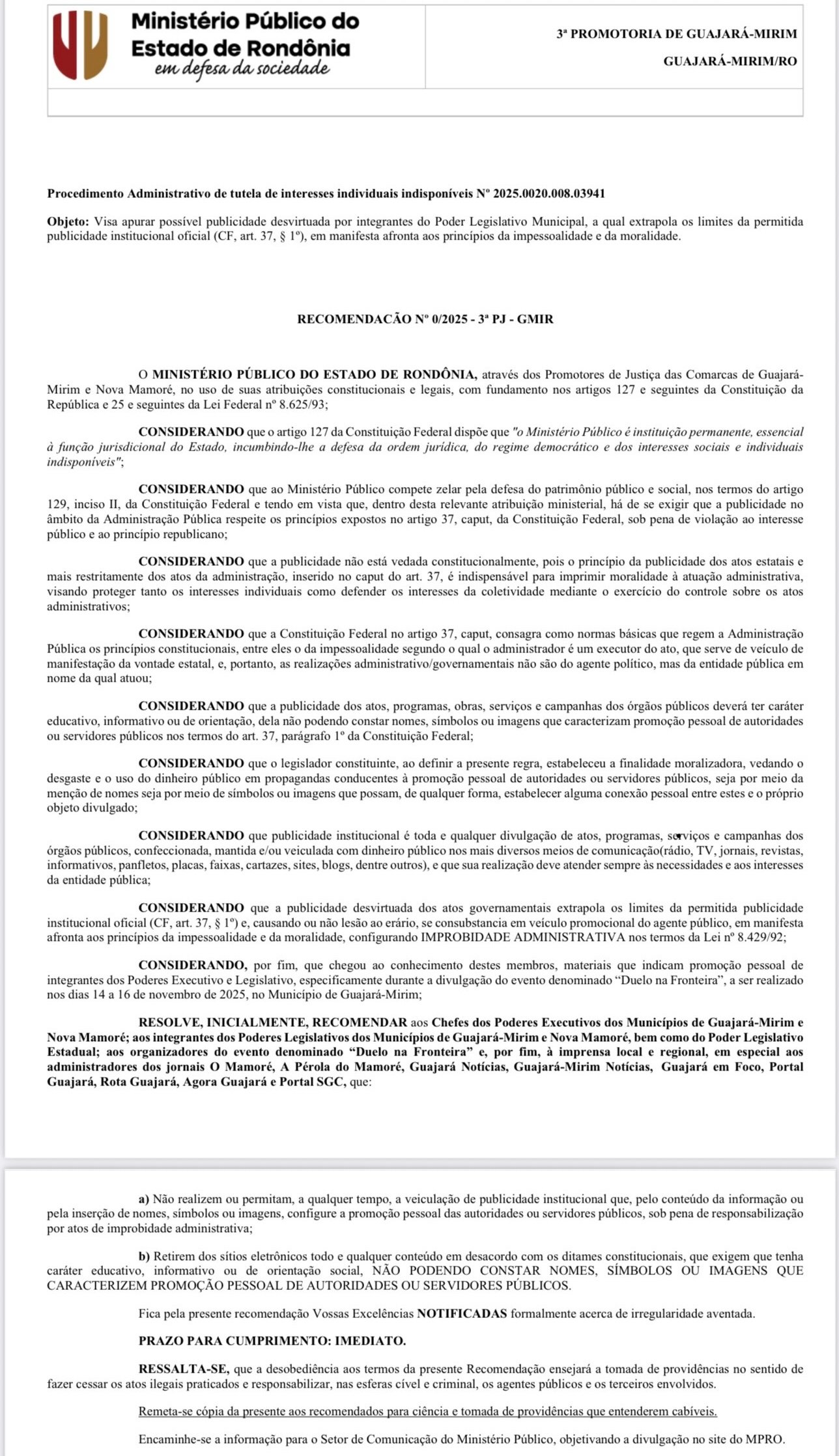 O Ministério Público de Rondônia (MPRO), por meio dos promotores de Justiça Cláudio Colaço Villarim e Antônio Carlos de Siqueira Júnior, recomendou que órgãos públicos, organizadores do evento e veículos de imprensa de Guajará-Mirim e Nova Mamoré retirem, de forma imediata, conteúdos de publicidade institucional irregular em portais de notícias que veicularam o “Duelo na Fronteira”, festa tradicional que acontece em Guajará-Mirim. A recomendação foi realizada na última quinta-feira (13/11).